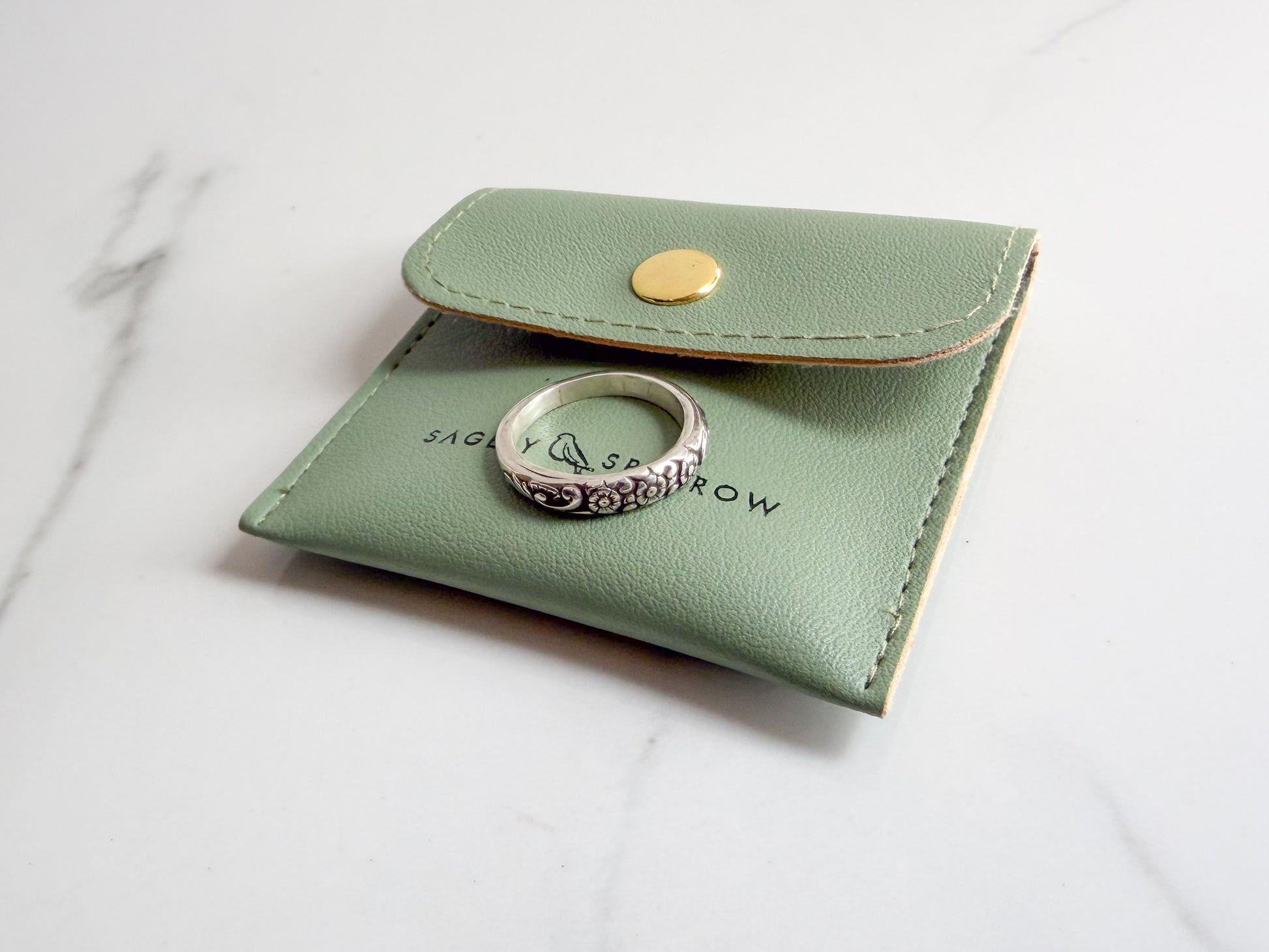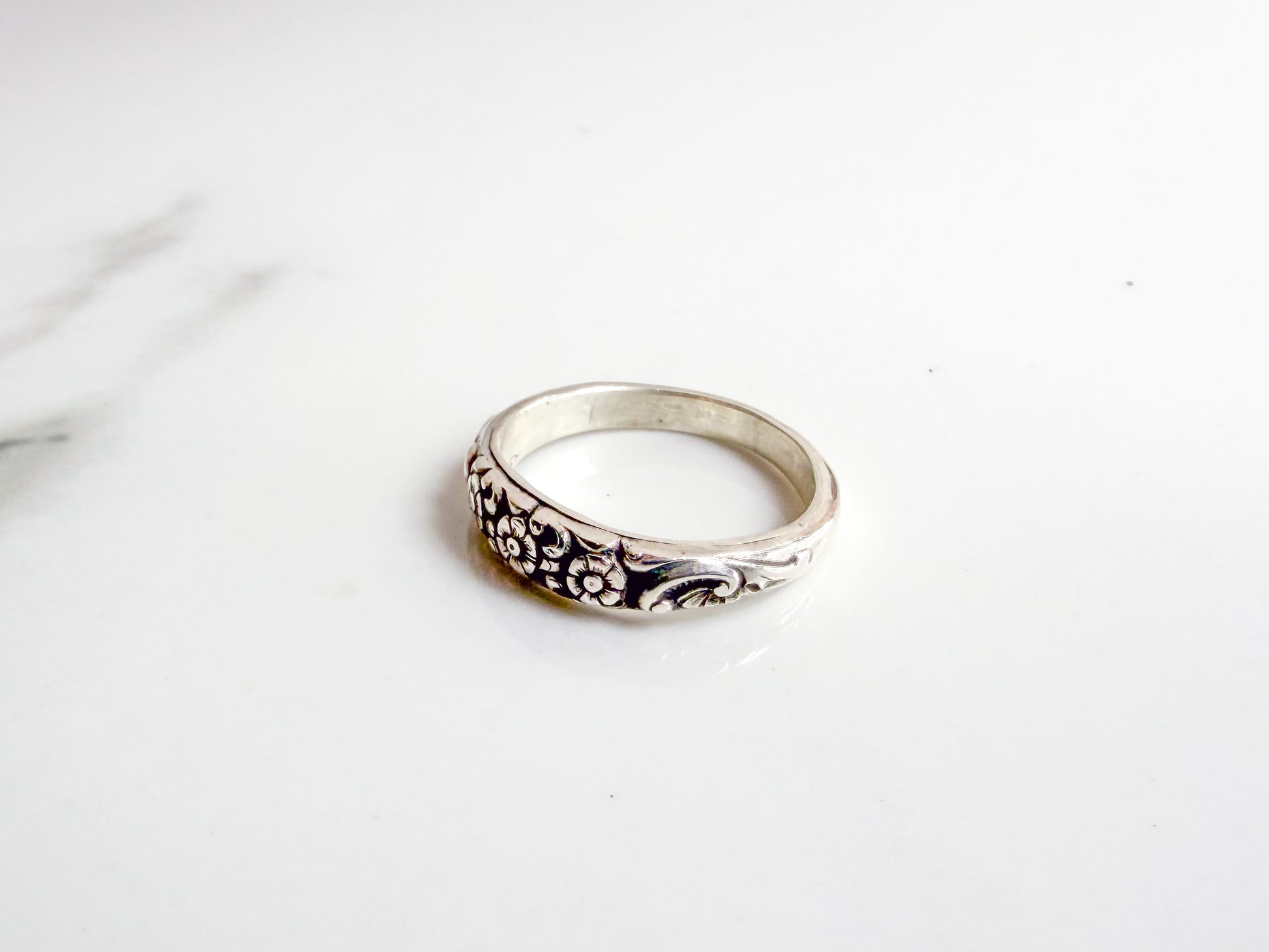 Inspired by the beloved “Little Flower,” this sterling silver ring features a trio of delicate daisies — a quiet, beautiful symbol of St. Thérèse of Lisieux’s humble path of holiness. Each ring is made to order and pressed with a vintage Larter & Sons design, then finished by hand, giving it a heritage feel that blends timeless design with heartfelt devotion. Whether gifted for a Confirmation, worn as a daily reminder of simplicity and trust, or chosen as a token of Catholic femininity, this floral band is a gentle companion on your journey of faith.