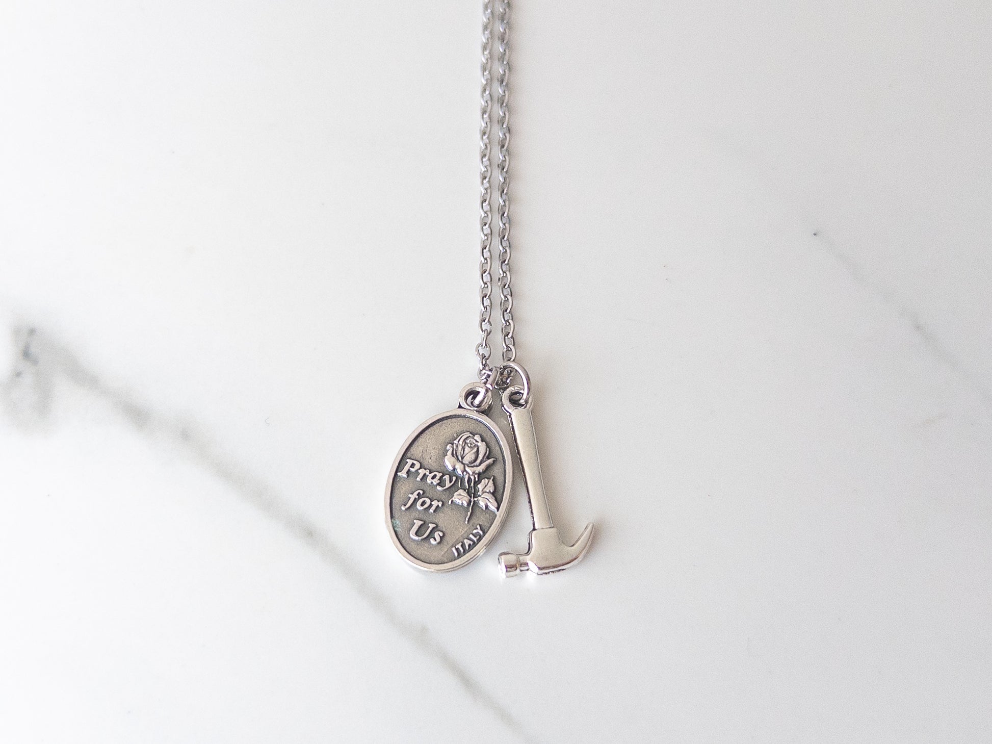 This Saint Joseph necklace for men features a detailed St. Joseph medal paired with a silver-tone hammer charm, symbolizing St. Joseph the Worker — patron saint of fathers and hardworking men.