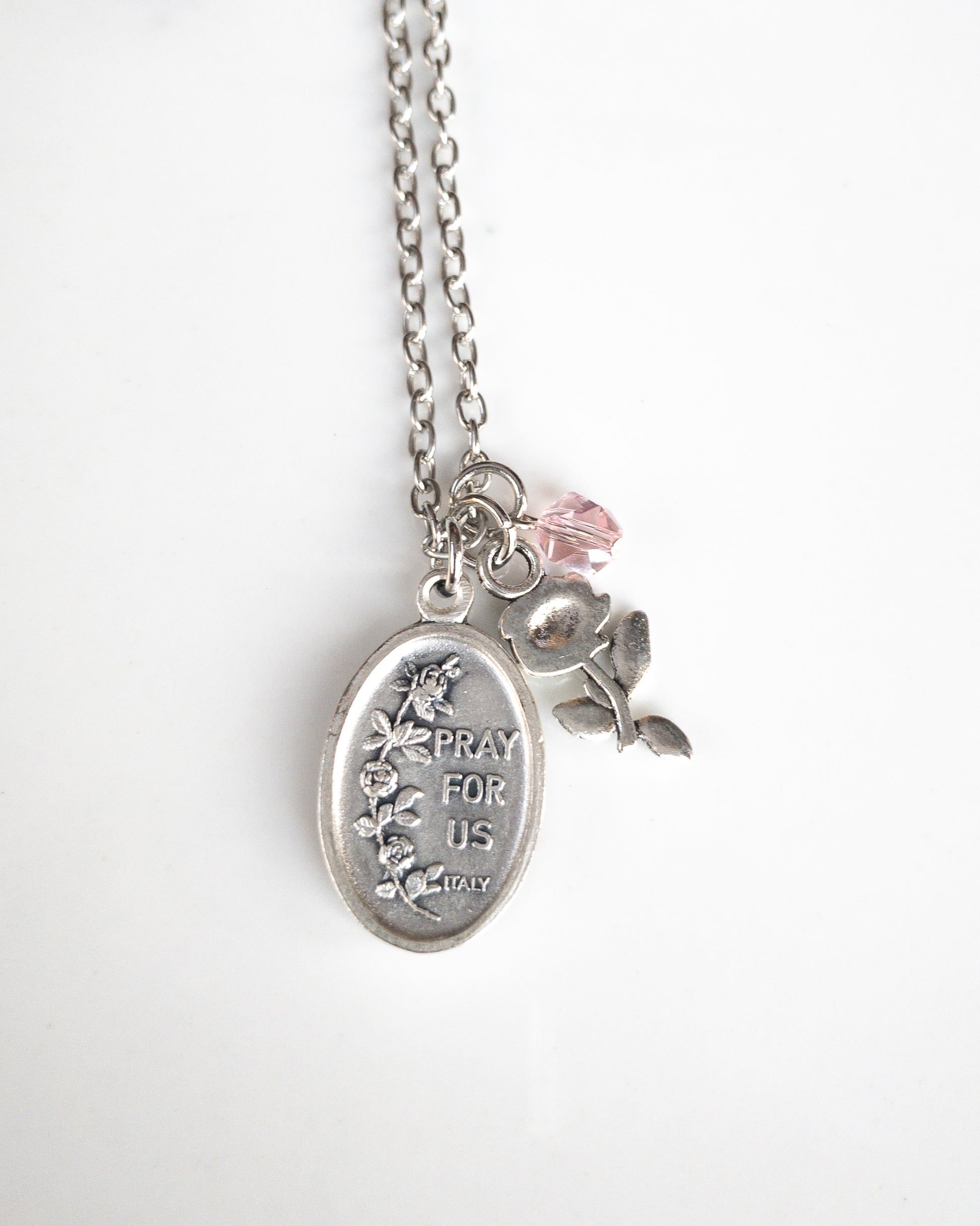 You'll love this St. Therese of Lisieux necklace! It makes a great gift for anyone with a devotion to the popular saint. It's perfect for Confirmation, First Communion, birthdays, Christmas, or just because. The necklace's chain is available in lengths of 18in and 24in and contains a silver colored rose charm, a clear pink faceted glass bead, and a Saint Therese (Theresa) medal, made in Italy with the words "PRAY FOR US" on the back. St. Therese is the patron saint of florists and gardeners and is affectionately known as "The Little Flower."