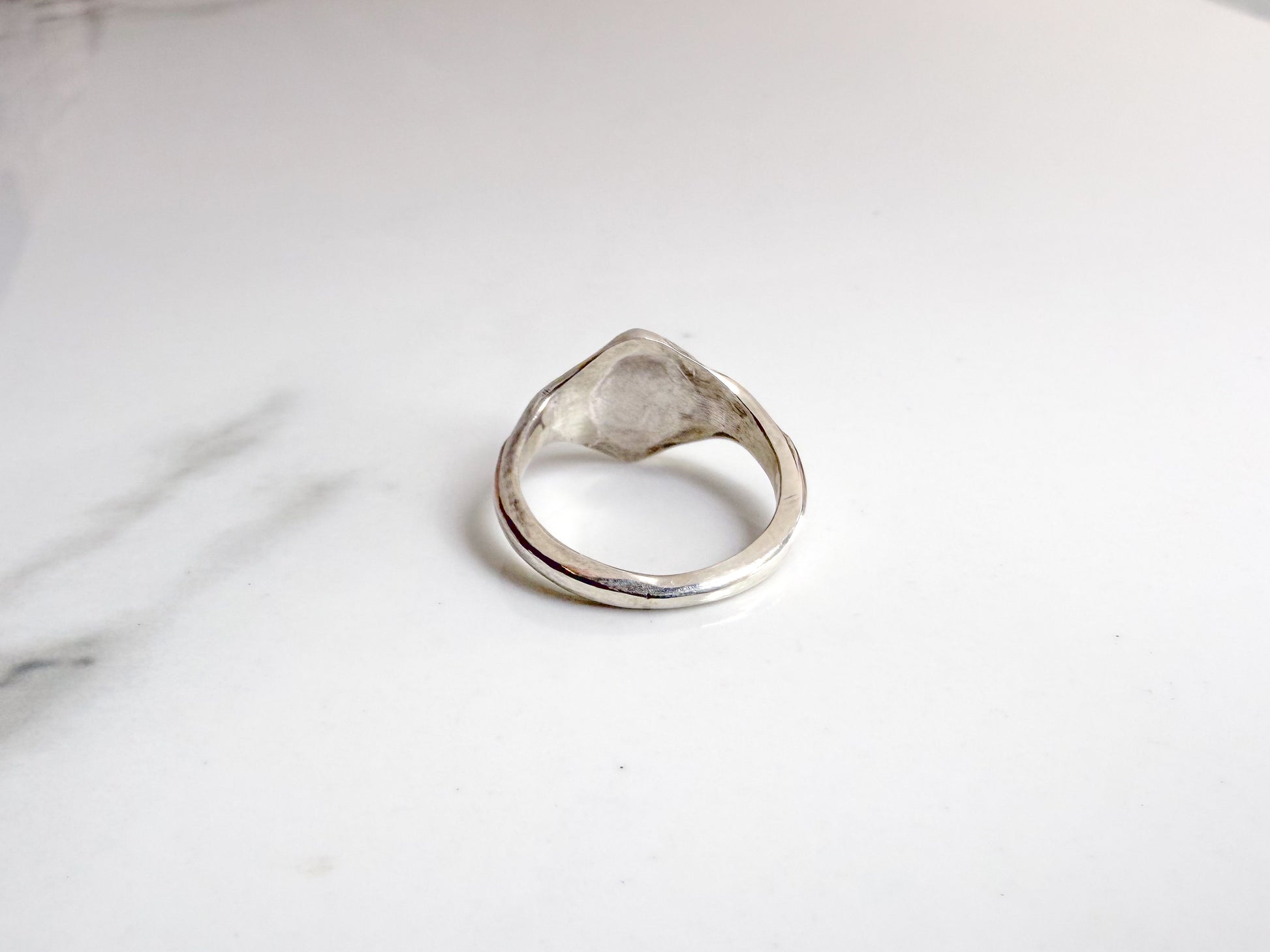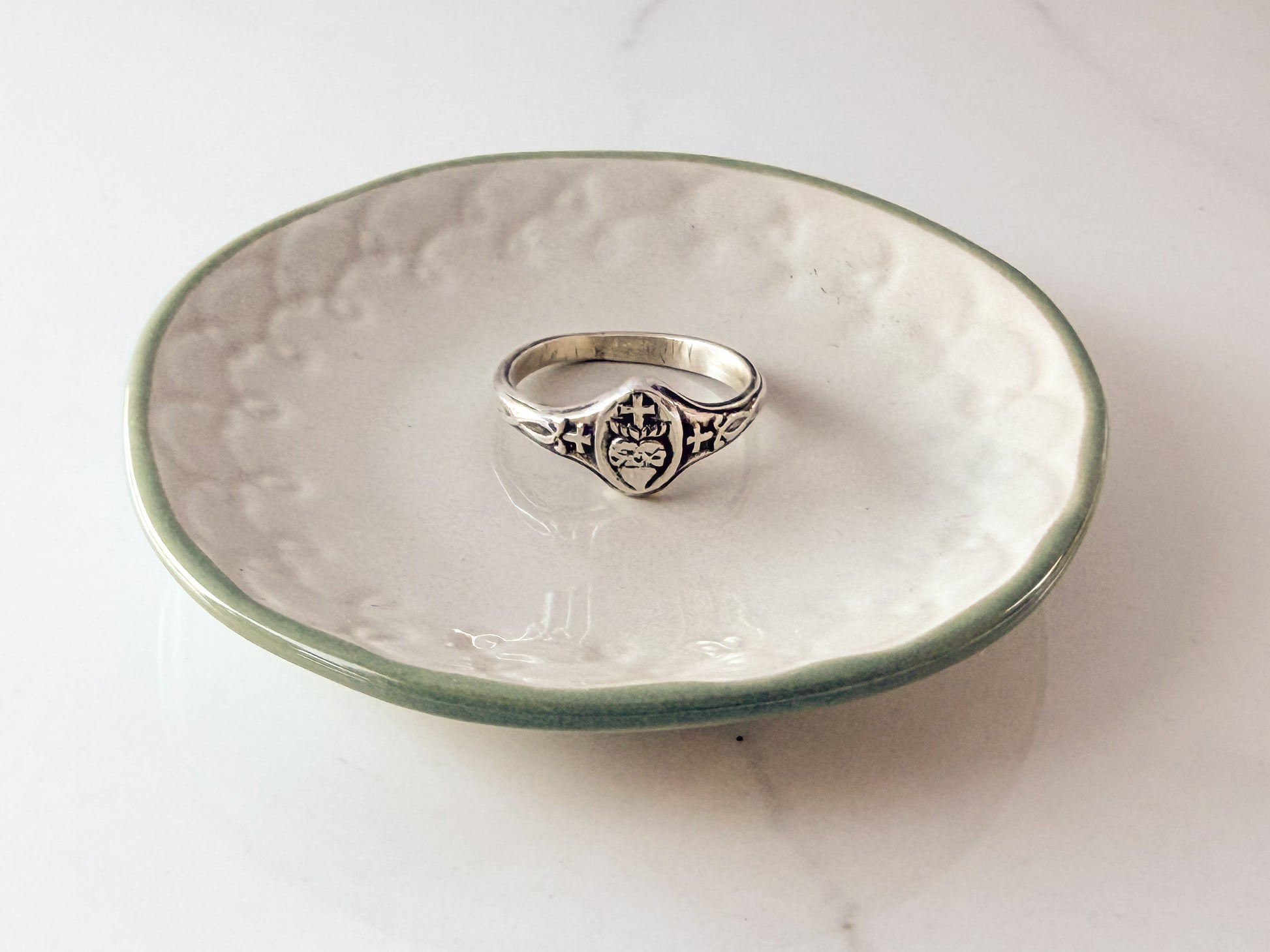 This sterling silver ring honors the Sacred Heart of Jesus — a symbol of divine love, mercy, and devotion. Made using a steel die from an original ring hub from Larter & Sons, a historic American jewelry firm that operated for nearly 150 years. This piece blends vintage artistry with modern craftsmanship. Each ring is formed using a hydraulic press in my home studio and carefully finished by hand. With its intricate detailing and prayerful symbolism, this heirloom-quality ring makes a deeply meaningful gift for sacraments or everyday devotion.